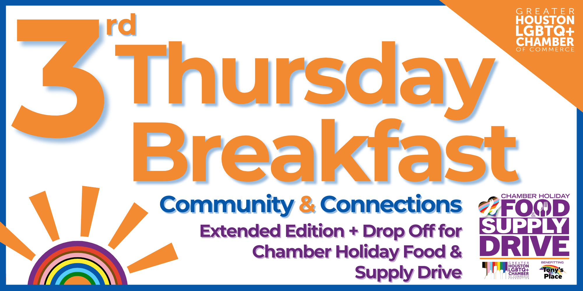 We will be collecting Food & Supplies for the Chamber Holiday Food & Supply Drive benefitting Tony's Place to support unhoused LGBTQ+ youth. Bring your donation for easy drop off!