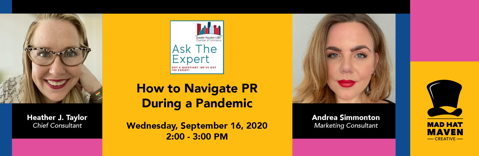 Many business owners have tons of questions when it comes to PR! Get the answers to these questions and more at our September Ask The Expert virtual session with our experts Heather J. Taylor and Andrea Simonton, with Chamber Member Mad Hat Maven. The Mad Hat Maven team will join us to share their expertise about PR and the critical role it plays for any business.